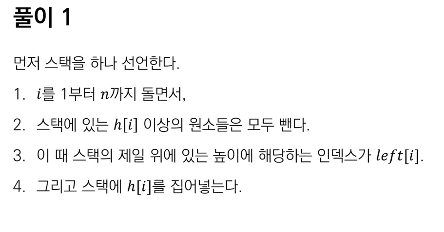 - 스택 사용 이유: 막대 A의 오른쪽에 A보다 낮은 막대 B가 나타나면, A와 A의 왼쪽에 있는 A보다 높은 모든 막대들은 B까지만 넓은 직사각형을 만들 수 있습니다.
