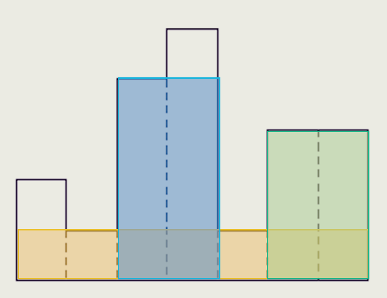 - 막대 3이 팝되고, 높이 6의 직사각형 면적이 계산된다(면적=6). 막대 2가 팝되고, 높이 5의 직사각형 면적이 계산된다(면적=10). 인덱스 4가 스택에 푸시된다.
