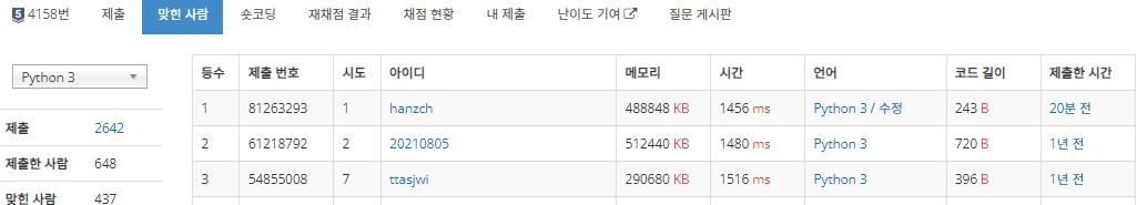 파이썬 3에서 1592ms 파이파이에서는 메모리 초과가 나왔다!!! 같은 코드인데!!