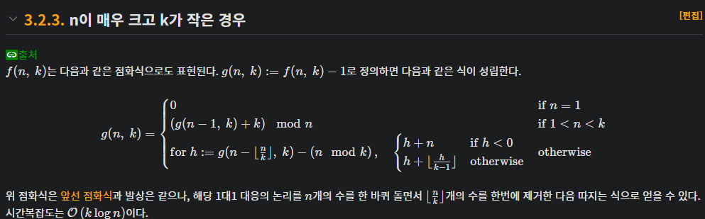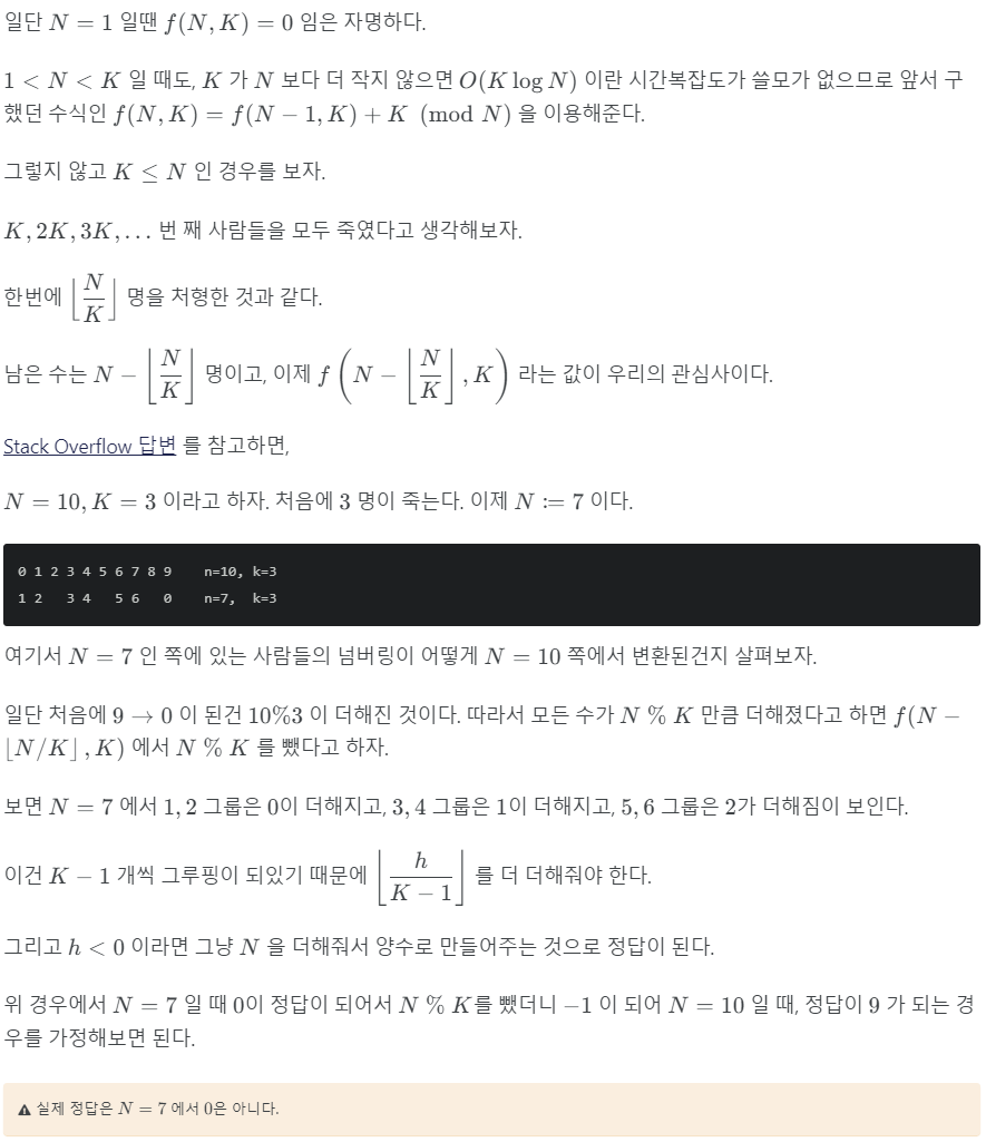 점화식을 통해 나온 값 f(n, k)는 n명을 원형으로 앉히고 k번째마다 제가하면 최종적으로 남는 인덱스를 출력한다.