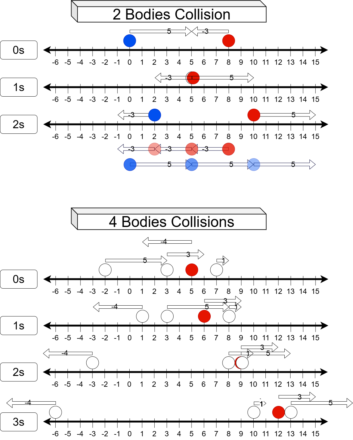 하지만 서로 순서가 바뀔 수 없다. 충돌이 없다고 가정한 t초 후의 위치를 계산하고 원래의 빨간 공의 순서에 있는 수직선상의 위치가 바로 빨간 공의 위치가 된다.