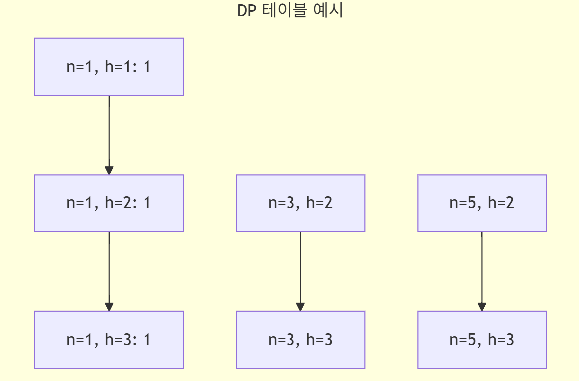 - 정확한 높이 계산: DP 테이블 $D(n, k)$는 최대 높이가 $k$인 트리의 개수를 포함합니다. 따라서 높이가 정확히 $k$인 트리의 가짓수는 $D(n, k) - D(n, k-1)$로 계산할 수 있습니다.