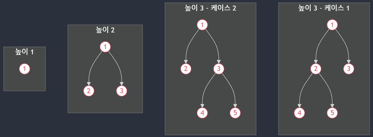 - 재귀 관계: 노드 수가 3 이상인 경우, 트리는 루트 노드와 두 개의 서브트리(왼쪽, 오른쪽)로 구성됩니다. 만약 왼쪽 서브트리의 노드 수를 $left$라고 하면, 오른쪽 서브트리의 노드 수는 $n - 1 - left$가 됩니다. 두 서브트리의 높이가 $h-1$를 만족하는 경우의 수를 곱한 값을 더하여 전체 경우의 수를 구합니다.