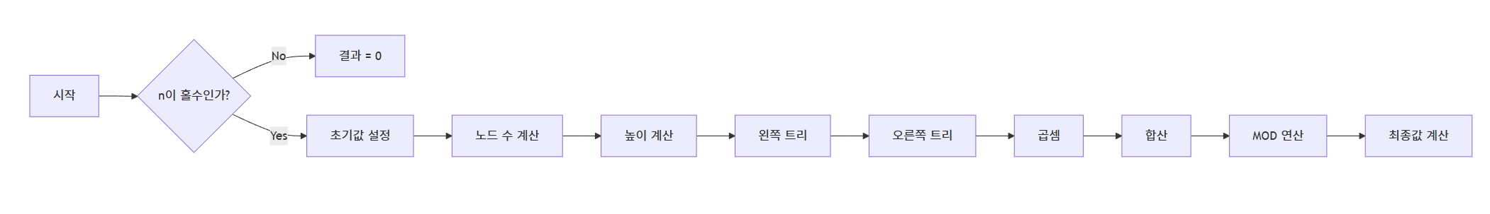 - 완전 이진트리의 조건: 각 노드는 자식이 0개 또는 2개여야 하므로, 전체 노드의 수 $n$은 반드시 홀수여야 합니다. 만약 $n$이 짝수라면 완전 이진트리를 구성할 수 없으므로 결과는 0입니다.