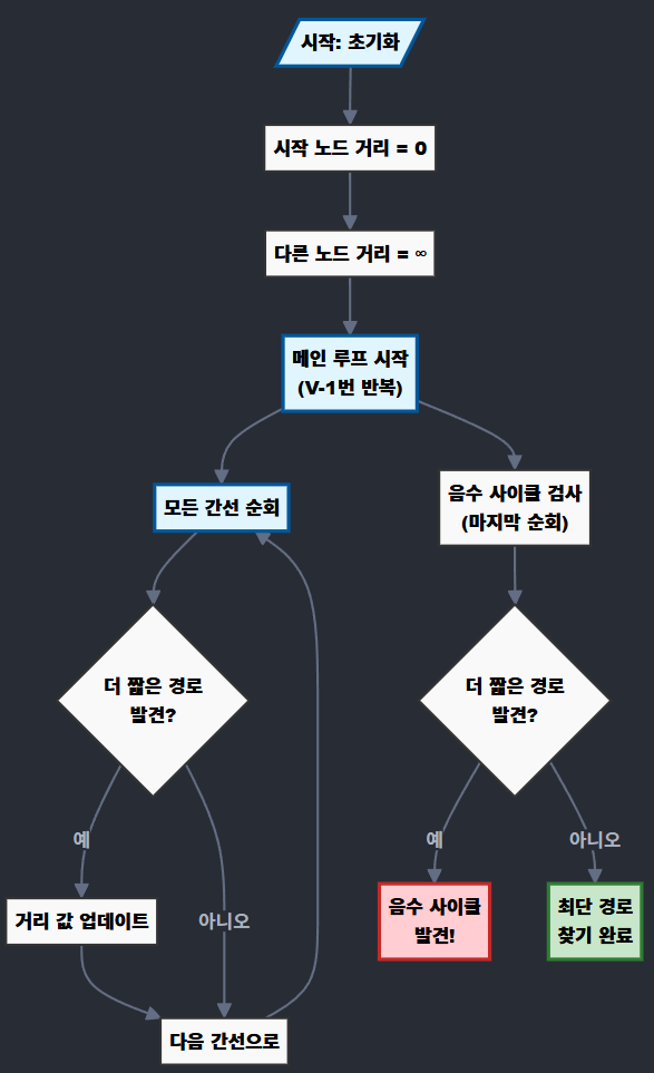 - 음수 가중치 지원: 다익스트라 알고리즘과 달리 음수 가중치 간선이 존재해도 올바른 최단 경로를 계산할 수 있습니다.
