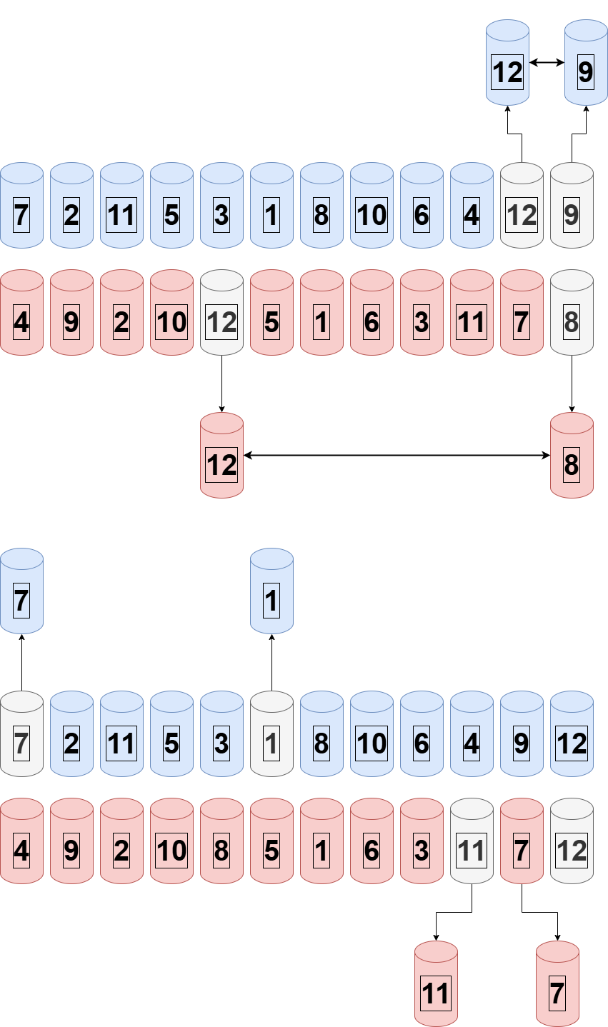 - 먼저 정렬을 완성한 쪽이 승리하며, 이후 상대가 정렬을 마칠 때까지 몇 번의 교환이 더 필요한지를 셉니다.