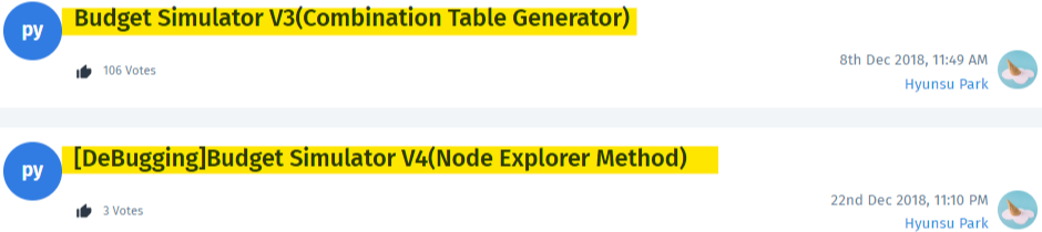 - 이 프로그램은 이전 버전이 해결했던 문제(예산을 모두 사용하여 일정 항목을 구매하는 방법 찾기)를 새로운 접근 방식으로 해결하려고 시도합니다. 이전 버전은 모든 항목의 최대 구매 가능 수량을 확인했습니다. 그래서 많은 불가능한 경우(예: 최대, 최대, 최대...)가 테스트되었습니다. 예산 내에서 각 항목의 최대 수량을 구매할 수는 없습니다. 왜냐하면 그것은 예산 내에서 한 항목만 살 경우의 최대구입 가능 수량이기 때문입니다. 하지만 프로그램은 그것을 확인하고 오류를 체크하느라 시간을 낭비했습니다. 또한 많은 예산이 남는 모든 경우 또한 확인해야 했으며, 이로 인해 작동 속도가 느려졌습니다. 예를 들어, V3는 다음 조건에서 문제를 해결하기 위해 240개의 경우를 확인해야 했습니다.