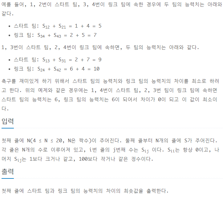 result = min(result, abs(allstat - sum(l))) # 모든 값의 절반 - 그 뽑은 2개 합의 차 = start팀 - link팀