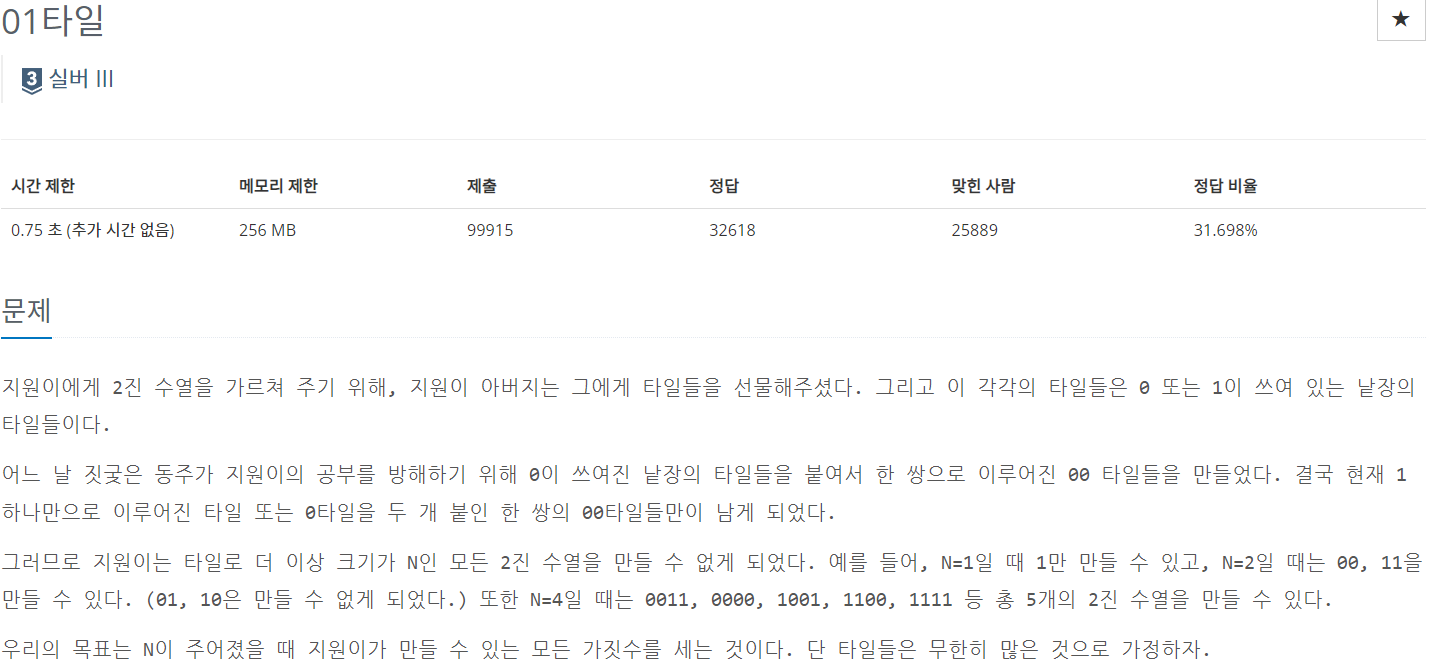 00이 쓰여진 타일과 1이 쓰여진 타일로 크기 N을 몇 가지 만들 수 있나? 라는 문제다.
