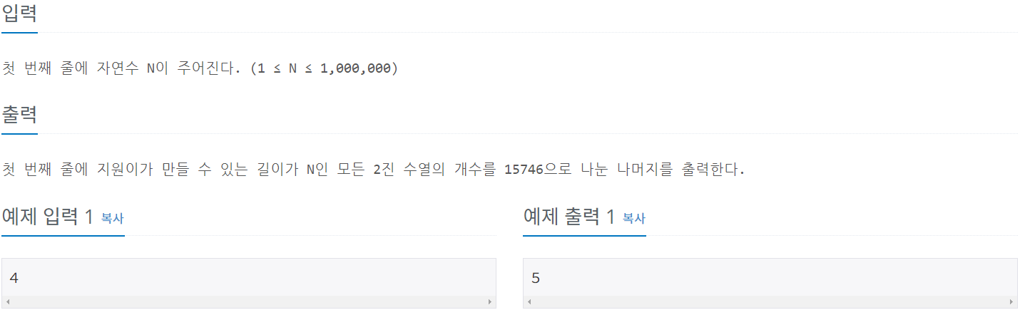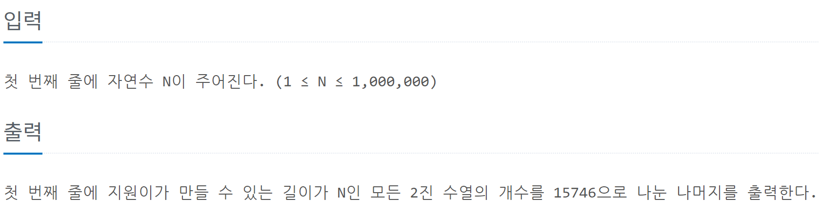 위 코드는 피보나치 수열을 빠르게 구하는 방법 중 하나를 구현한 것이며, 입력값에 해당하는 피보나치 수를 15746으로 나눈 나머지를 출력합니다. 이렇게 나머지를 구하는 이유는 수가 커지면서 발생할 수 있는 오버플로우를 방지하기 위함입니다.