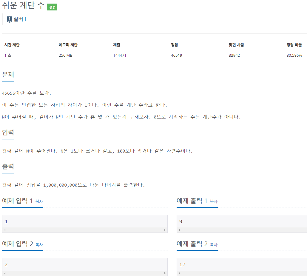 - (dp[1][i] = 1) (1<= i <= 9), 길이가 1이고 마지막 숫자가 (i)인 계단 수는 1개